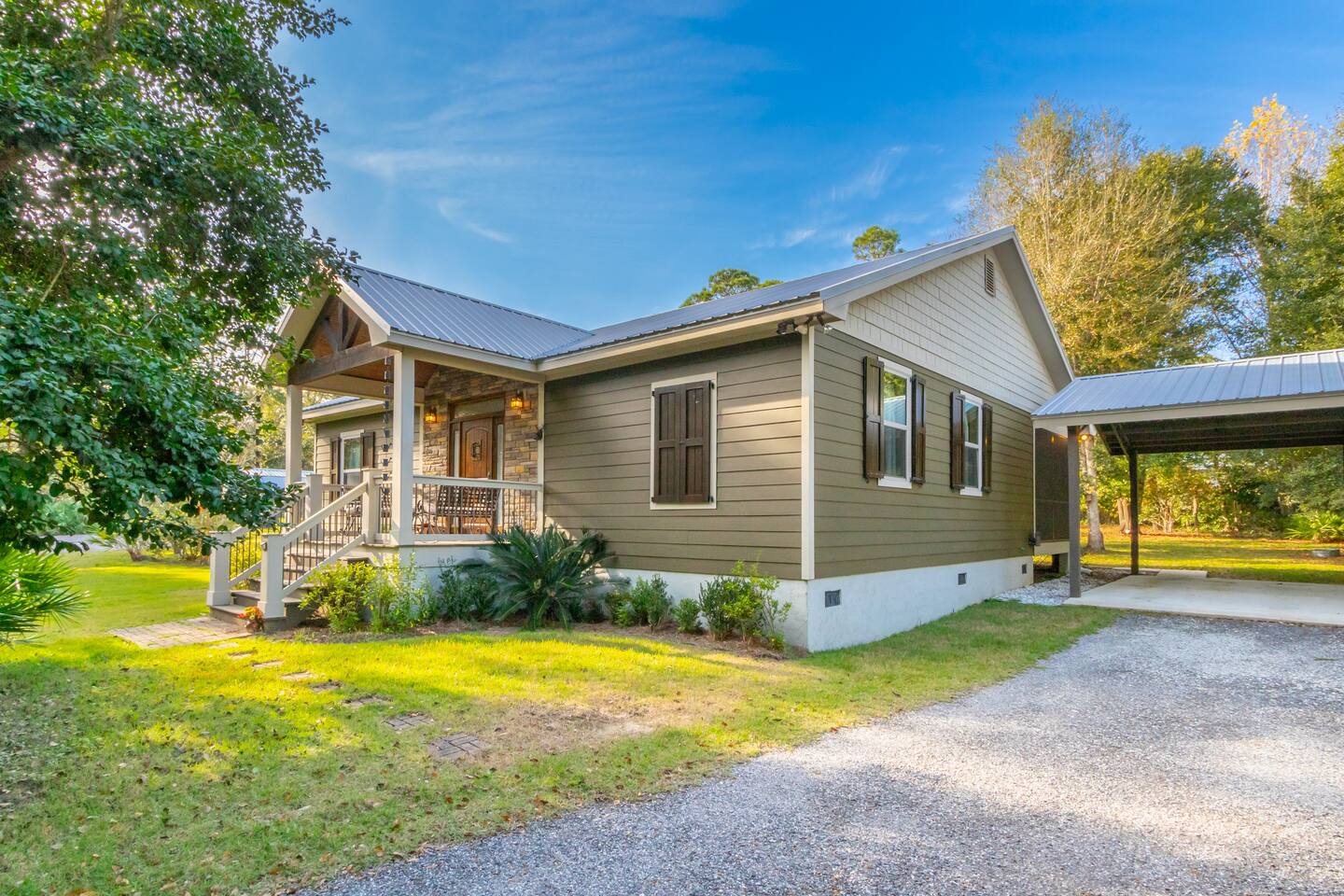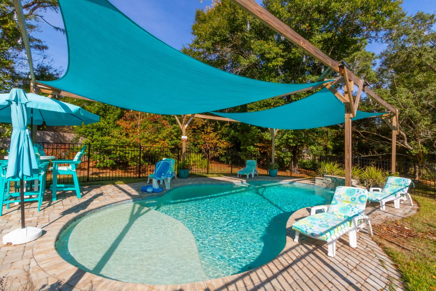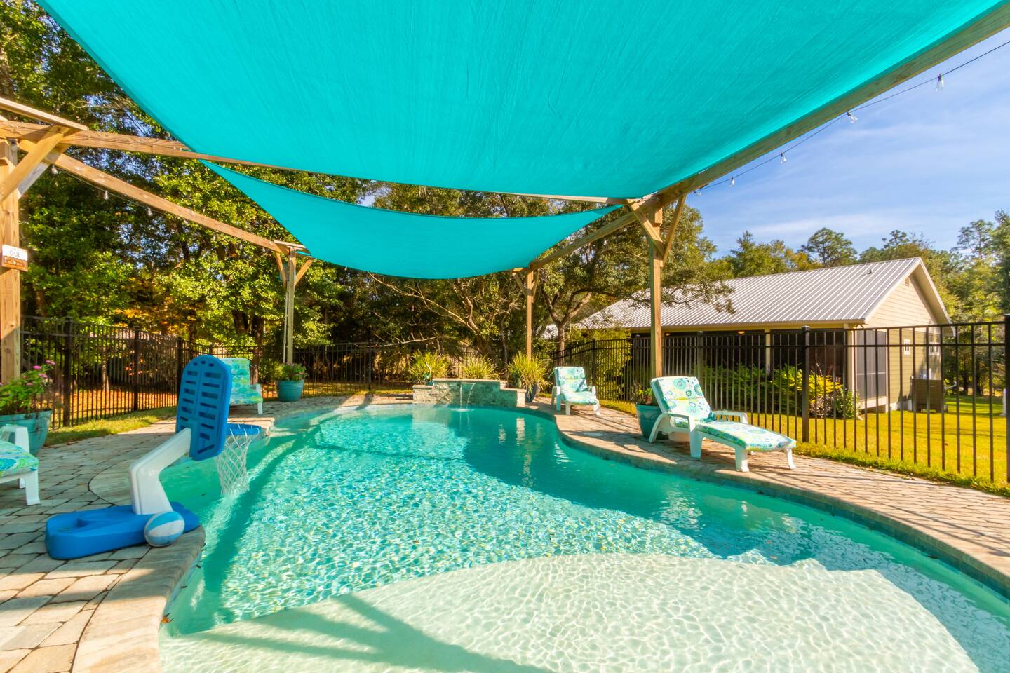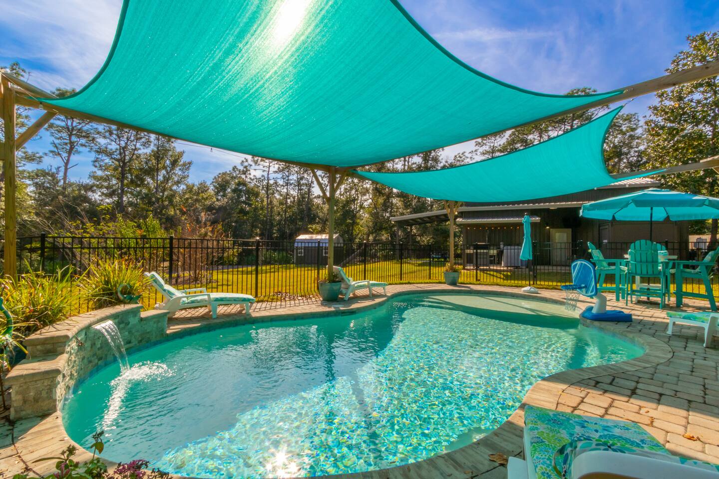 Step into a peaceful cabin-style escape where warmth, comfort, and nature come together. This beautifully crafted 2-bedroom, 2-bath home features rich wood interiors, vaulted ceilings, and a cozy yet refined lodge feel throughout. The spacious kitchen is fully equipped with ample counter space, perfect for cooking and gathering. Outside, unwind in the serene swimming pool complete with a stunning waterfall, surrounded by lush greenery and privacy. Located just minutes from Soldiers Creek and a brand-new public boat launch, this dog-friendly retreat is ideal for boating, relaxing, and slowing down. Whether you’re sipping coffee on the porch, enjoying quiet evenings indoors, or spending days on the water, this home offers a true getaway experience. Sleeping Arrangements (up to 6 guests): The home features a comfortable King bed, a cozy Queen bed, and a high-quality self-inflating air mattress that can be set up in the living room for additional guests. Perfect for families or small groups needing flexible sleeping space. The Pool is not currently heated. Nearby Attractions: Gulf Shores: 17 mi Orange Beach: 10 mi OWA Amusement Park: 14 mi Alabama Gulf Coast Zoo: 15 mi The Track: 16 mi The Wharf: 13 mi 🐾 Pet Friendly with fee (see rules below) 🐾 Snowbirds Welcome!